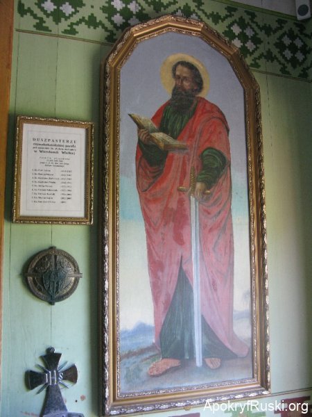 Warto zwrócić uwagę na to, że przy wejściu do cerkwi wisi kartka papieru z opisem historii Wierchomli Wielkiej, zob.: Cerkiew, druga galeria.
